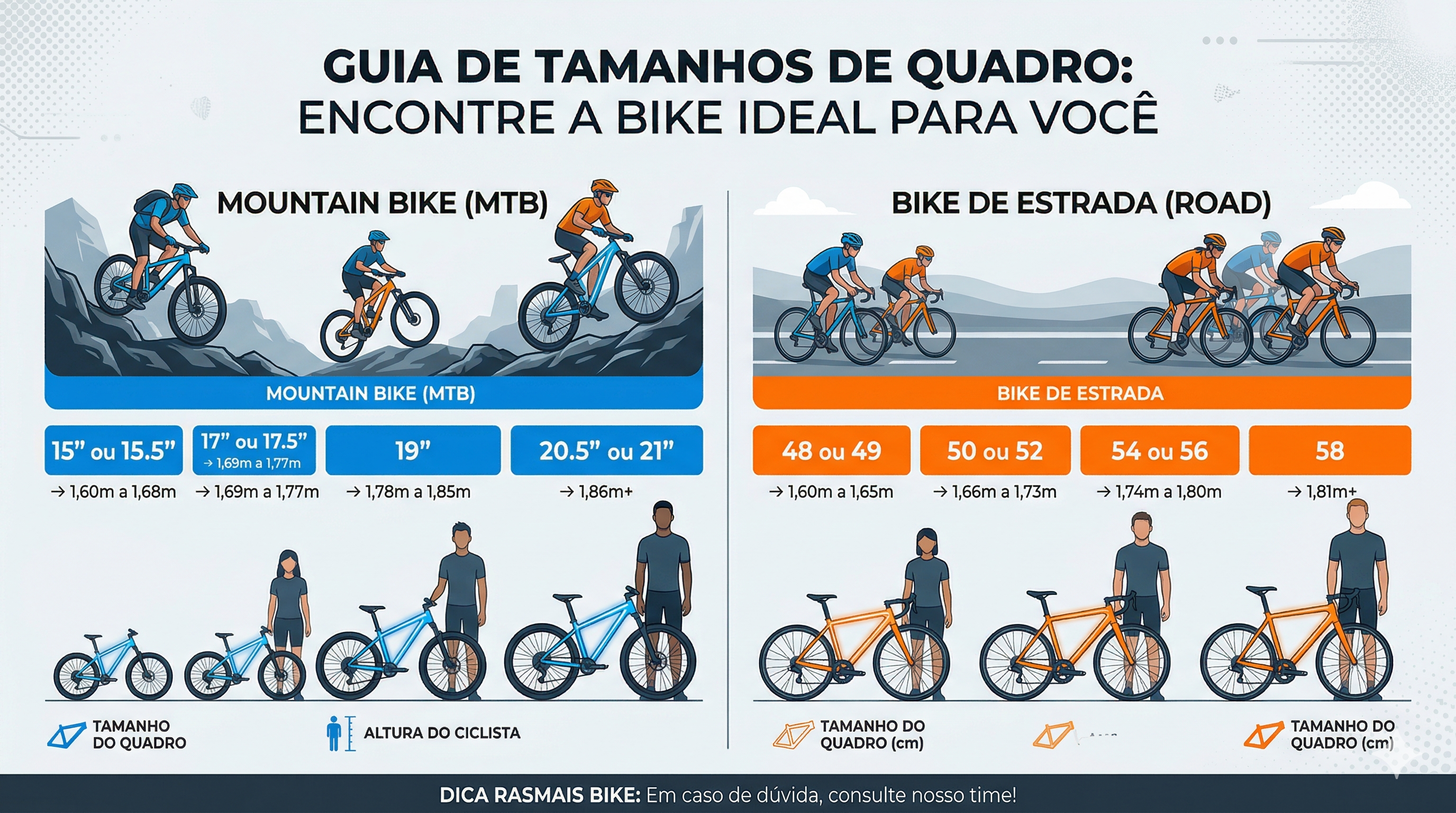 Dúvida sobre qual bike comprar? Criamos um guia simplificado para você escolher entre Mountain Bike ou Road sem erros. Confira as tabelas de altura e tamanhos de quadro abaixo antes de fechar seu pedido.